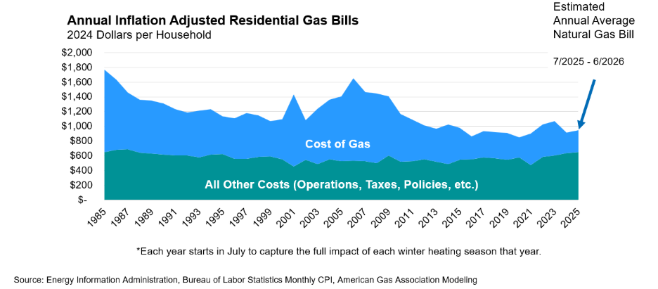 Natural gas doesn’t just cost less today – it’s used more efficiently. The average natural gas home now consumes far less fuel for the same applications as in previous decades. Utilities have also reduced leaks by more than 70% since 1990, further cutting fuel costs. As a result, natural gas now accounts for a much smaller share of total bills than it once did.
