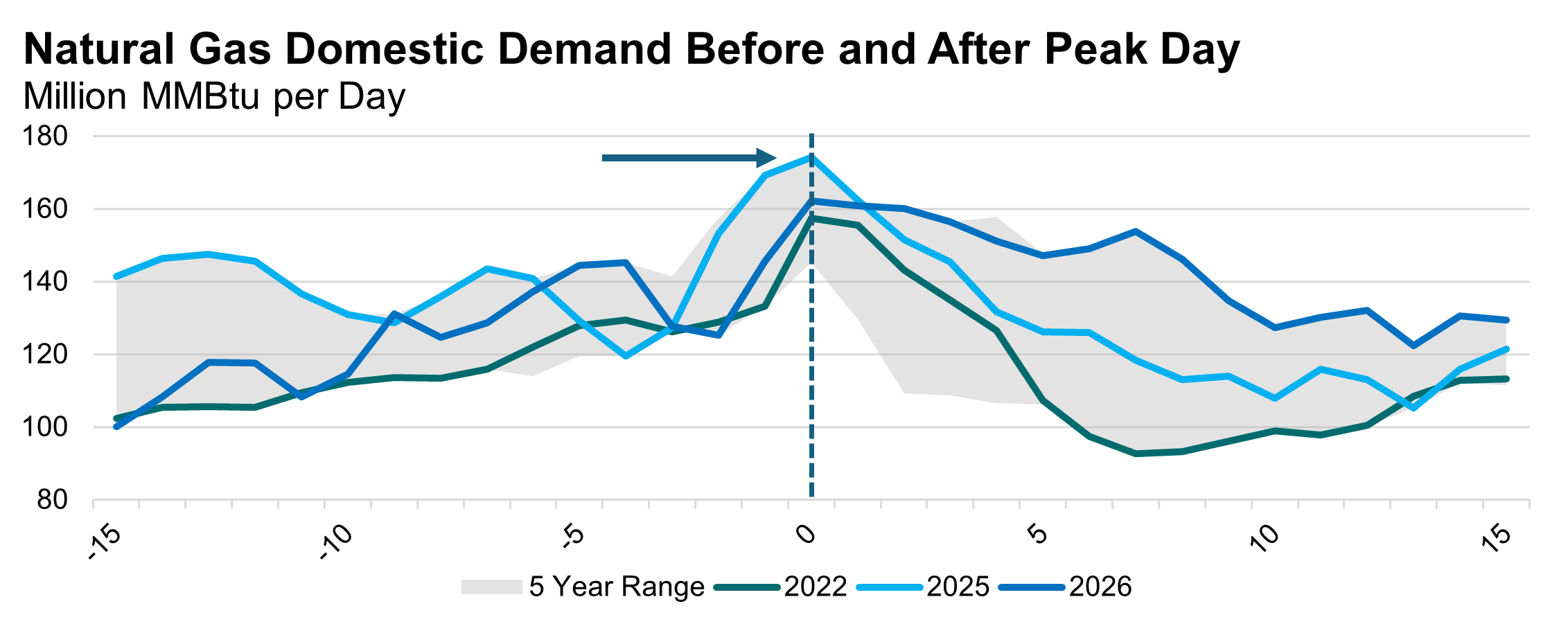 - Although this winter did not set a new single-day record, it did exceed the total amount of gas delivered in the 15 days leading up to and after the annual peak day. Relative to the recent peak in 2022, daily demand this winter exceeded 2022 levels on most days during the comparable +/- 15-day period.