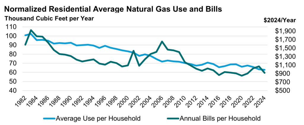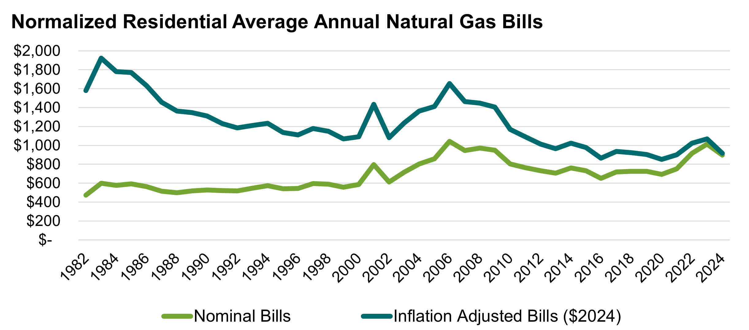 Inflation-adjusted residential gas bills have dropped by nearly half since 1982, reflecting both lower per-household use and sustained affordability of natural gas prices.