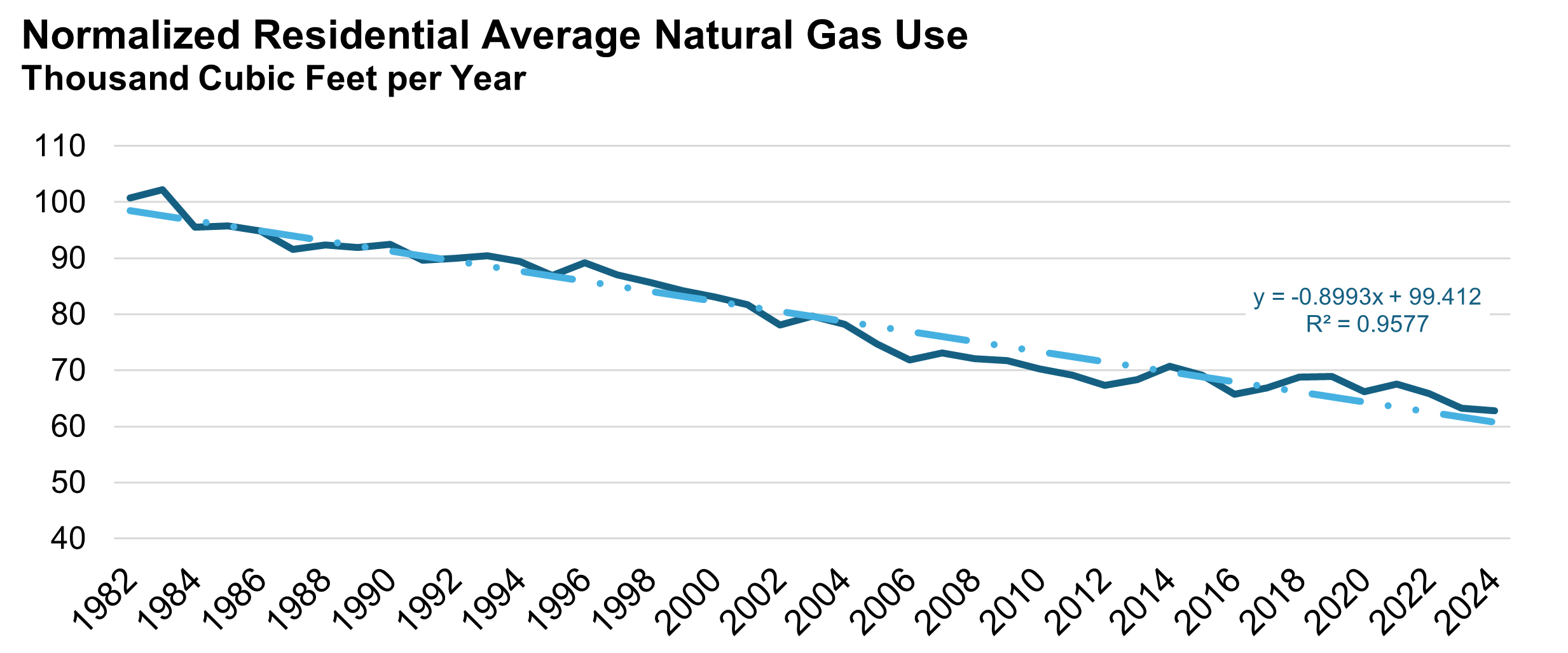 Consumption was normalized using NOAA heating degree day (HDD) data to isolate structural efficiency improvements independent of weather. Normalization used the ratio of actual HDDs to the 30-year normal. Average use is calculated by dividing total normalized consumption by the number of residential households that utilized natural gas that year. Average normalized gas use has declined steadily, dropping by about 38% since the early 1980s, or roughly 1.1% per year, showing the cumulative impact of improved insulation, tighter construction, and the widespread adoption of high-efficiency furnaces and other appliances, utility efficiency programs, and consumer conservation.