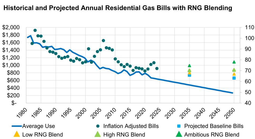 Even with RNG blended into natural gas supply, projected 2050 household bills remain comparable to today’s while achieving a steep reduction in emissions.