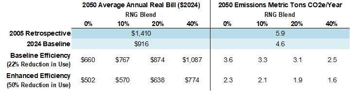 Under the enhanced-efficiency case modeled, the projected average annual bills are $502 with no RNG; $570 with a 10% RNG blend; $638 with 20%; and $774 with 40% (all in 2024 dollars). Emissions reductions reach 50% with no RNG and approximately 54% (10% blend), 58% (20% blend), and 65% (40% blend) relative to 2005 levels.