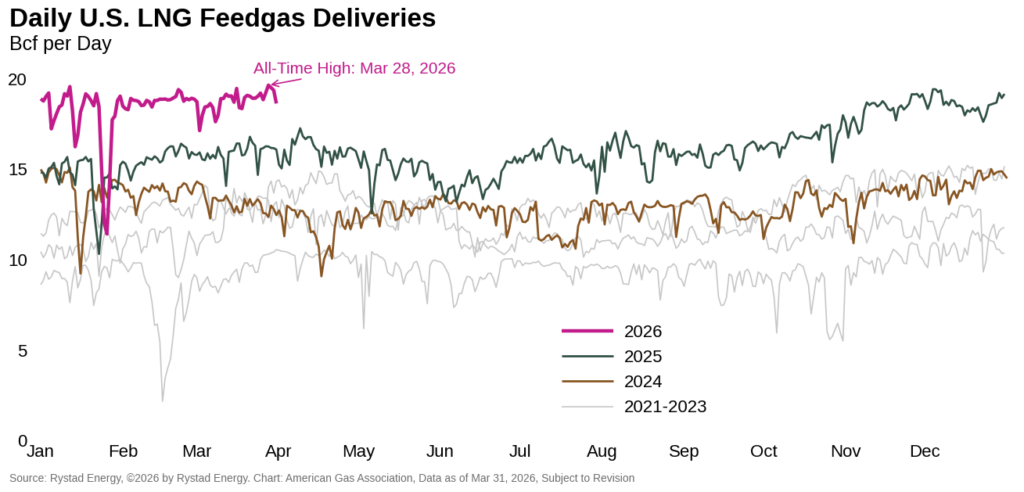 U.S. LNG feedgas flows reached a record high of 19.7 Bcf per day on March 28, surpassing the previous all-time high set on January 12, 2026, by 0.4 percent, according to preliminary data from Rystad Energy. The record coincides with the first production of LNG from Train 1 at Golden Pass LNG’s Sabine Pass terminal on March 30, after ramping feedgas deliveries to the liquefaction plant to roughly 0.3 Bcf per day in mid-March. For the year to date through March 31, feedgas deliveries are more than 20 percent higher than year-ago levels.