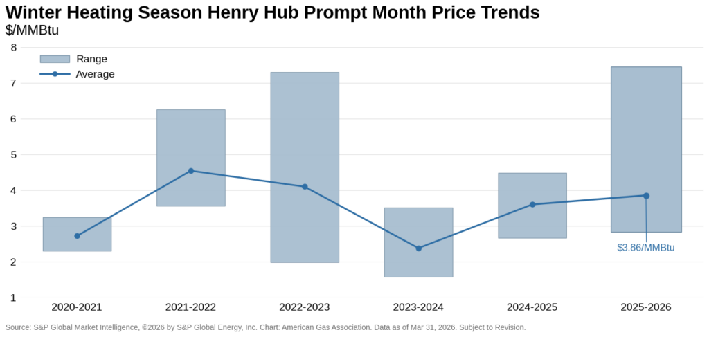 Throughout March, the Henry Hub prompt month struggled to hold above $3 per MMBtu, averaging $3.04 and finishing 2.6 percent lower than the first trading day of the month. Futures remained relatively soft overall, reflecting easing winter demand and stable inventory levels as the market transitions into the spring shoulder season. For the 2025-2026 winter heating season, prompt-month prices averaged $3.86 per MMBtu.