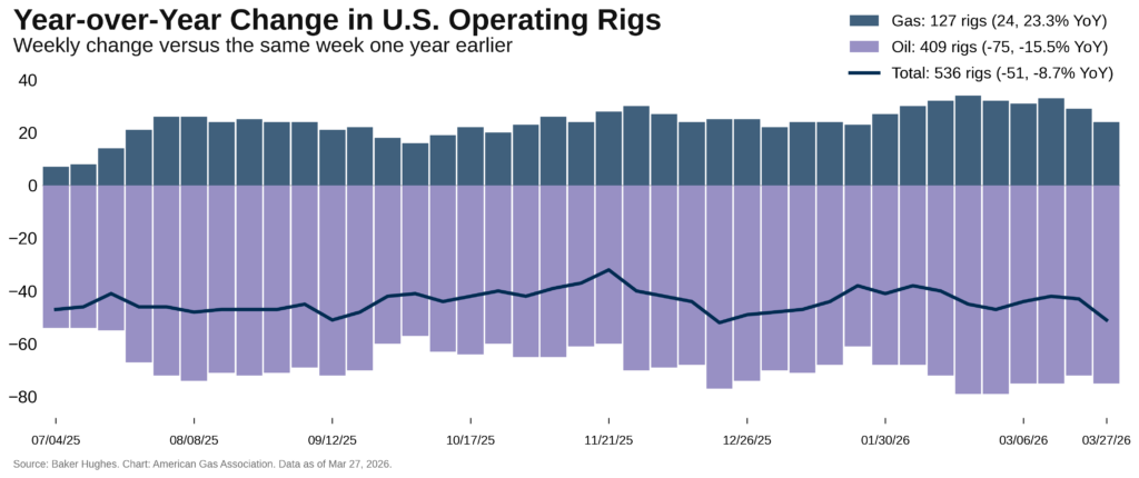 Rig count data from Baker Hughes show that the total U.S. rig count declined by nine to 543 for the week ending March 27, a change of 1.6 percent. Gas-directed rigs decreased by four to 127, while oil rigs increased by five to 409.