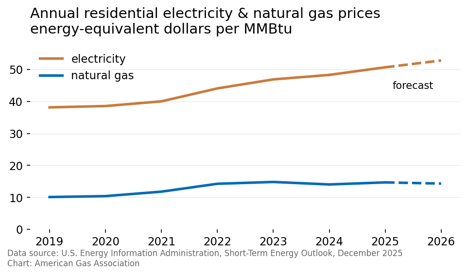 The December Short-Term Energy Outlook from EIA raised its winter spot price forecast to an average of almost $4.30 per MMBtu due to the colder start to the winter. However, the average 2026 spot price only rose 1 cent to $4.01 per MMBtu. Notably, the residential retail natural gas rates are expected to decline in 2026, reflecting regional supply availability and pricing trends. Retail electricity rates are expected to rise next year.