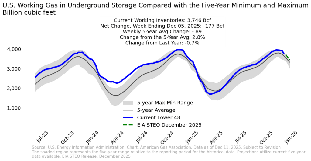 Colder temperatures in early December led to the largest weekly withdrawal from underground storage since February 2025. For the week ending December 5, the EIA reported a net withdrawal of 177 Bcf, leaving lower 48 underground storage at 3,746 Bcf. Inventories now stand 2.8 percent above the five-year average but 0.7 percent below year-ago levels.