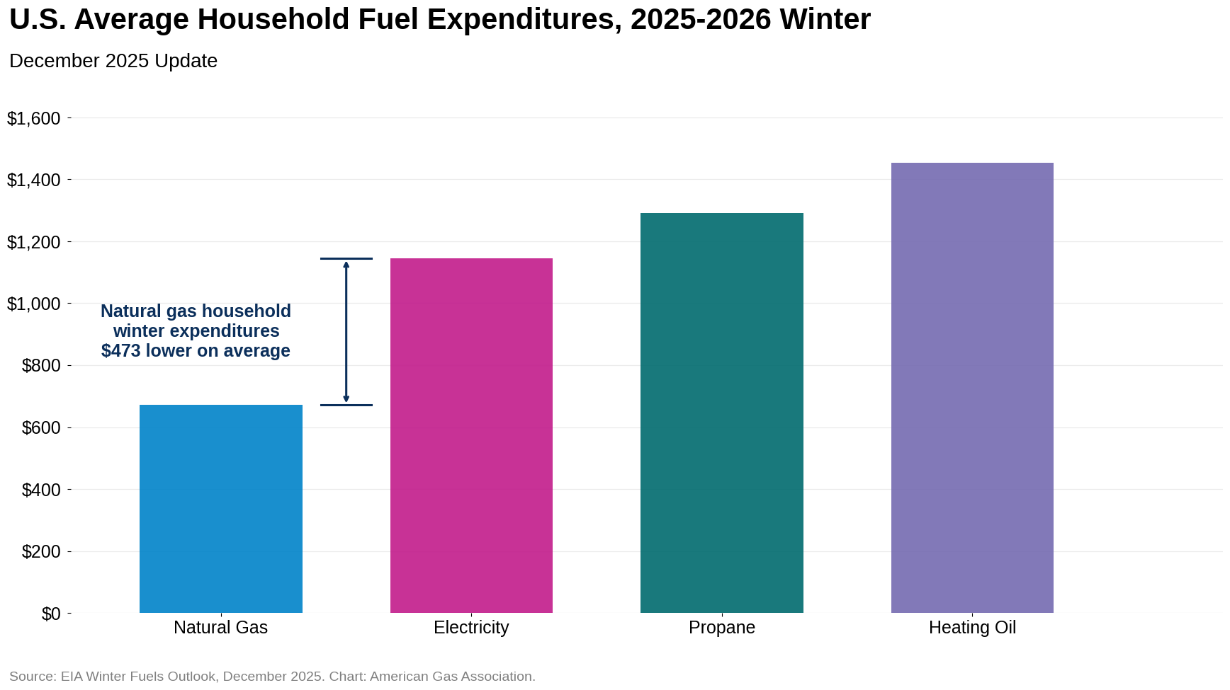 The EIA continues to project that households heated with natural gas will face lower total heating costs this winter than those using electricity. In its December 15 Today in Energy analysis accompanying the Winter Fuels Outlook, the EIA noted that its 2025-2026 residential winter expenditure estimates have increased since the initial mid-October outlook, reflecting expectations for colder temperatures and higher retail energy price forecasts. Nevertheless, EIA’s latest average U.S. projections still show lower winter expenditures for natural gas-heated homes (i.e., $671) than for electricity-heated homes (i.e., $1,144), implying electricity-heated households are projected to spend about 70 percent more this winter.