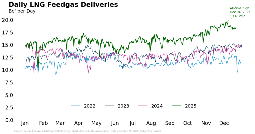 For the month to date through December 21, feedgas deliveries are 3.2 percent higher than the same period in November and 32.6 percent higher than the first three weeks of December 2024. Year to date, feedgas deliveries are up more than 23 percent, well on track for a new annual record.