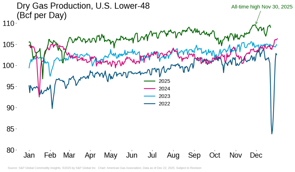 After reaching an all-time daily high at the end of last month, U.S. natural gas production briefly dipped in mid-December but has since rebounded. As of December 22, output is 0.5 percent below its late-November peak, according to preliminary data from S&P Global, but remains 4.8 percent higher than the same period last year.