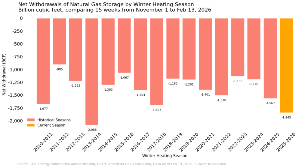 Net withdrawals from natural gas underground storage assets have eased following Winter Storm Fern. After a record net withdrawal of 360 Bcf for the week ending January 30, the EIA reports that net withdrawals from working gas stocks slowed to 249 Bcf for the week ending February 6 and 144 Bcf for the week ending February 13. From November 1 through February 13, cumulative net withdrawals of 1.8 Tcf rank as the second largest since at least 2010, trailing the 2013-2014 winter by 14.3 percent.