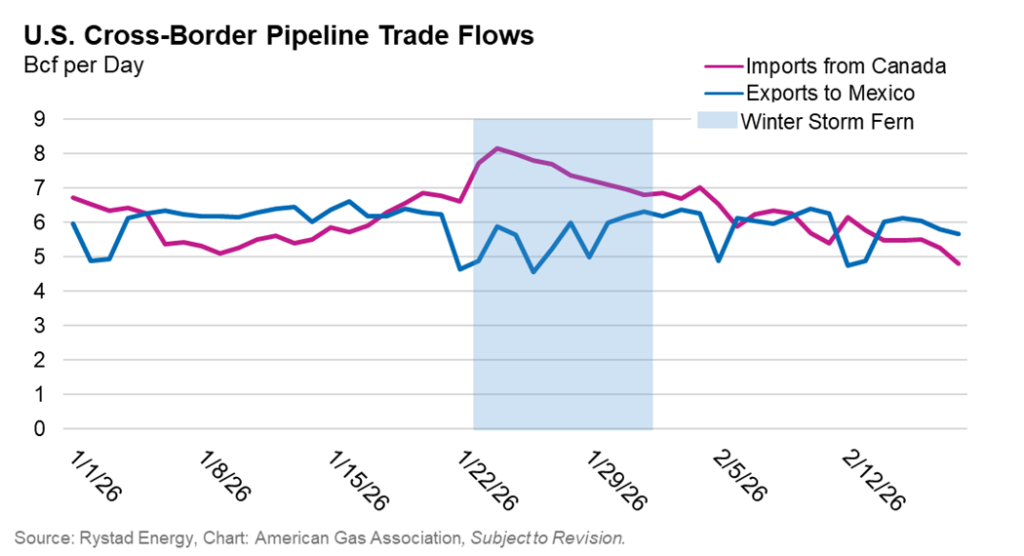 From January 1 through 21, Canadian imports averaged 5.9 Bcf per day and exports to Mexico averaged 6.1 Bcf per day, according to data from Rystad Energy. From January 22 to 31, the height of Winter Storm Fern, imports from Canada rose 25.6 percent and exports to Mexico fell 11.8 percent. Month to date through February 18), trade has largely returned to pre-event levels, with imports falling to an average of 6.0 Bcf per day and exports to Mexico climbing to an average of 5.9 Bcf per day.