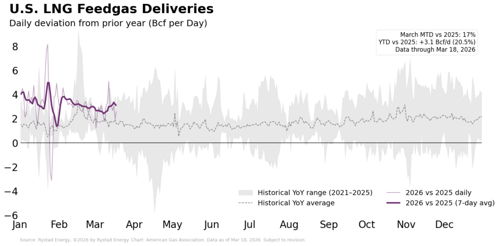 U.S. LNG feedgas deliveries remain in record territory as the 2025-2026 winter heating season comes to a close. Although volumes remain below the all-time high reached in January, the more notable development is the sustained year-over-year uplift in feedgas demand. Through March 18, month-to-date feedgas deliveries are 17.4 percent higher than the same period in 2025, according to preliminary data from Rystad Energy. Year to date, average volumes are 3.1 Bcf per day above year-ago levels, an increase of nearly 21 percent. That increase has remained consistently positive through early 2025 and sits well above the average year-over-year variation observed in recent years.