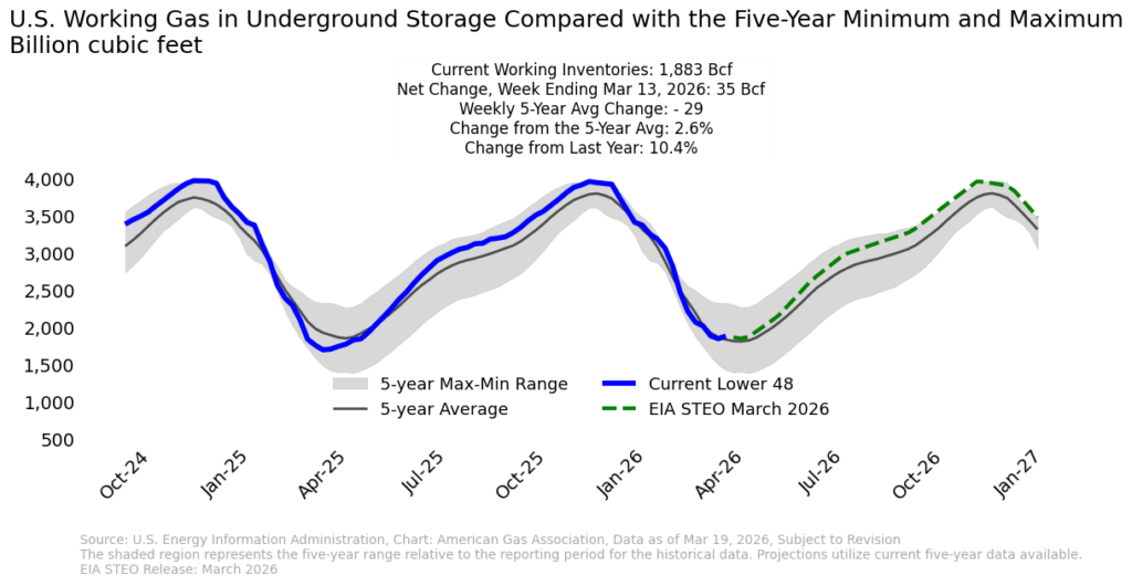 Robust gas utility portfolio planning and strong domestic natural gas supply fundamentals continue to anchor U.S. market stability, even as geopolitical risks escalate. Rystad Energy reports that Iranian missiles have damaged Ras Laffan, the world’s largest LNG hub, which accounts for about 20 percent of global supply. The disruption has placed upward pressure on European and Asian natural gas prices, with the Dutch Title Transfer Facility (TTF) front month price increasing nearly 32 percent overnight to $24.19 per MMBtu. Asian markets are likewise facing tightness in the near term, with the Japan/Korea Marker (JKM) increasing nearly 25 percent from March 17 to 18. In the U.S., intraday prices at the Henry Hub moved modestly higher, rising about $0.20 per MMBtu compared to Wednesday’s close.