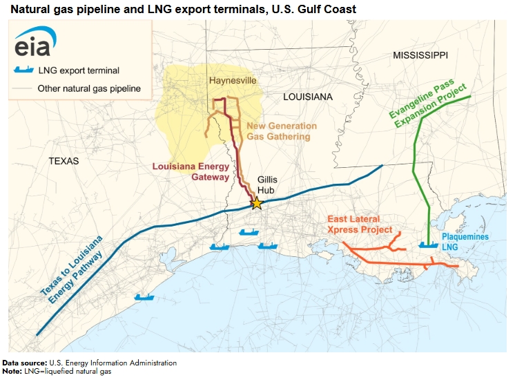 The EIA reports that in 2025, the U.S. increased its pipeline capacity by approximately 6.3 Bcf per day, with about 85 percent of additions located in the South Central region. As shown on the map below, most new additions supported upstream connectivity, particularly the Louisiana Energy Gateway and New Generation Gas Gathering projects linking Haynesville supply to the Gillis Hub, operating primarily as gathering systems that move natural gas from producers into the interstate transmission network. Several projects also targeted LNG demand growth, including two that deliver feedgas directly to Plaquemines LNG.