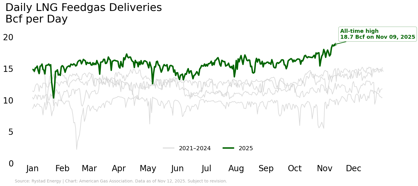 LNG feedgas continues to shatter records. After reaching a new all-time high on October 26, preliminary data from Rystad Energy shows that capacity at export facilities has continued to ramp higher, reaching 18.7 Bcf per day on November 9. Record feedgas levels reflect the rapid commissioning of Venture Global’s Plaquemines LNG—the fastest ramp-up of any U.S. export terminal to date—and steady increases at Cheniere’s Corpus Christi Stage III, both of which are adding substantial new liquefaction capacity along the Gulf Coast. Feedgas averaged 18.1 Bcf per day for the week ending November 12, a 33 percent increase over the same period in 2024.