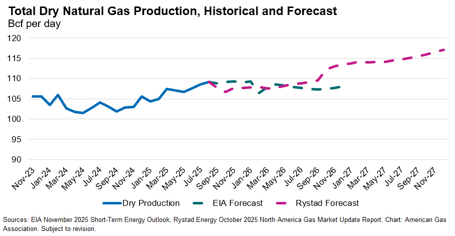 Looking ahead, current Energy Information Administration (EIA) and Rystad Energy forecasts project 2025 natural gas production to be 4.4 percent and 3.7 percent higher, respectively, than 2024 levels. Into 2026, the EIA’s current forecast anticipates flat production, while Rystad Energy projects production to increase more than 2 percent over 2025 levels, averaging 109.5 Bcf per day next year.