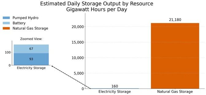 Storage is a critical balancing tool for natural gas utilities during the winter, with a daily dispatch capacity 130x greater than electric storage.