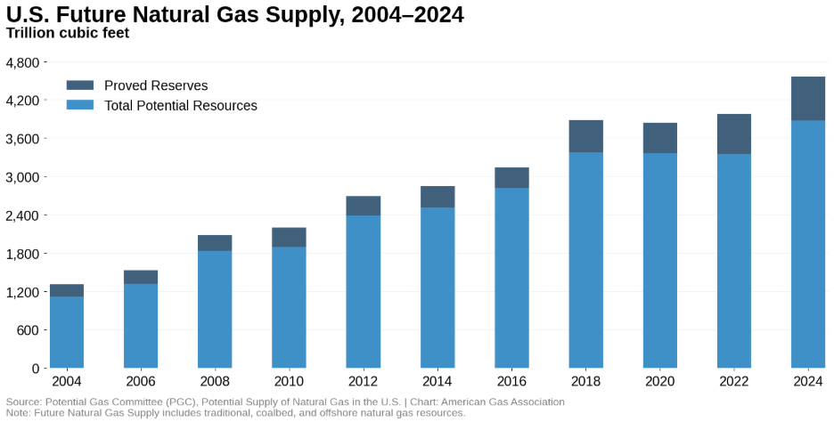 Advances in drilling technology also made more natural gas technically recoverable. Today, continuous innovations in everything from ground penetrating radar to AI algorithms continue to uncover new deposits, with total and proved reserves standing at their highest levels on record.