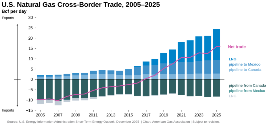Perhaps most dramatically, America became an export superpower. What had once been characterized by expensive imports became lucrative exports. The U.S. is currently the largest of exporter of LNG in the world, and on track to set a new record in 2025. Cross-border trade with our Mexican and Canadian friends and neighbors likewise surged, with exports to Mexico in 2025 approximately 844% higher than projected in 2005, and imports from Canada 20% lower than projected.